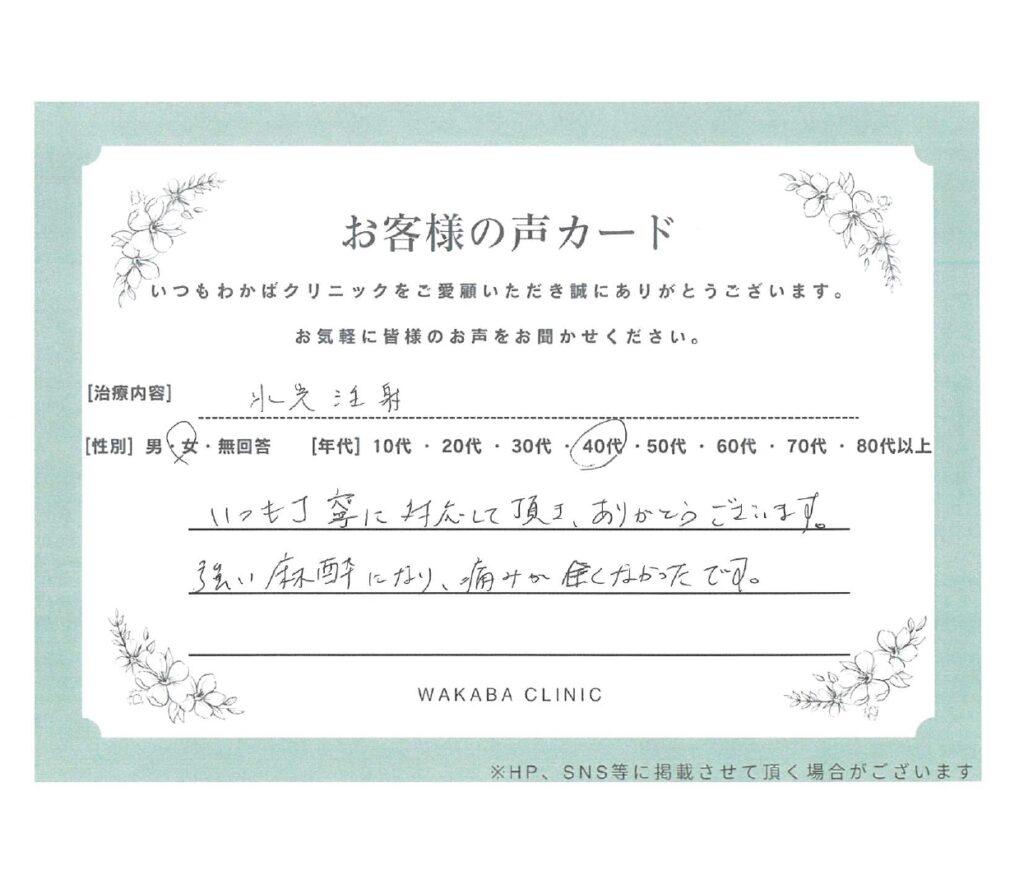 「いつも丁寧に対応して頂き、ありがとうございます。強い麻酔になり、痛みが全く無かったです。」